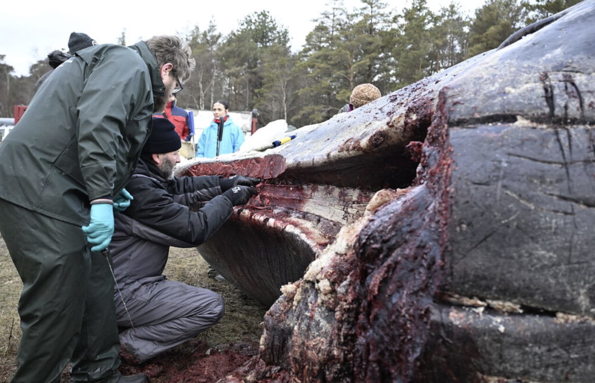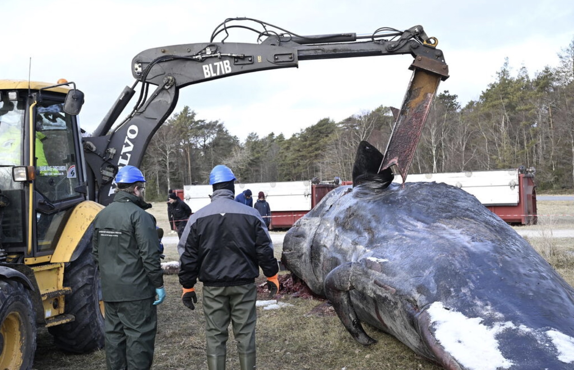 Eftir mátingina møtti líkskoðanartoyminum trupulleikum við at fáa røttu útgerðina á rennigravara til at hjálpa til við at fáa hvalin út.