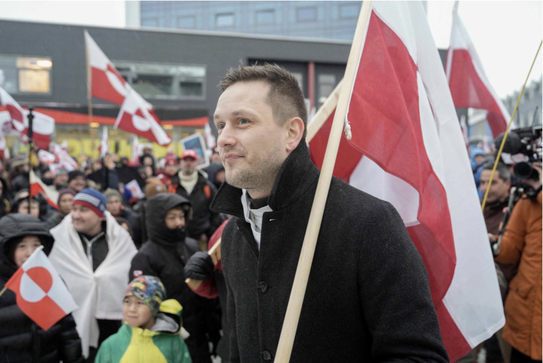 Sambært DR møtti Jens-Frederik Nielsen til mótmælisgonguna við megafoni í hondini. Hann hevði eisini eitt grønlendskt flagg við sær.