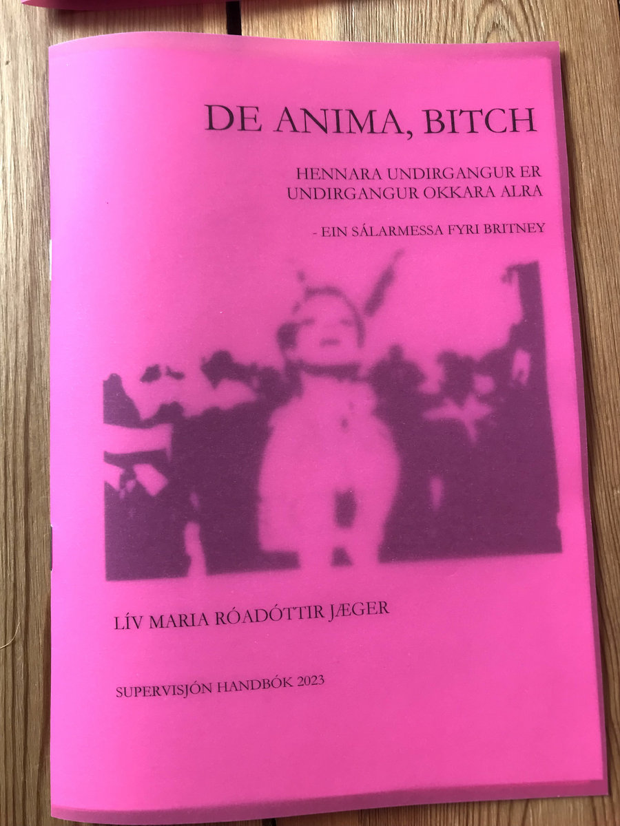 Hetta er baksýnið í DE ANIMA, BITCH við undirheitinum Hennara undirgangur er undirgangur okkara alra – ein sálarmessa fyri Britney, sum Lív Maria Róadóttir Jæger gav út í 2023.