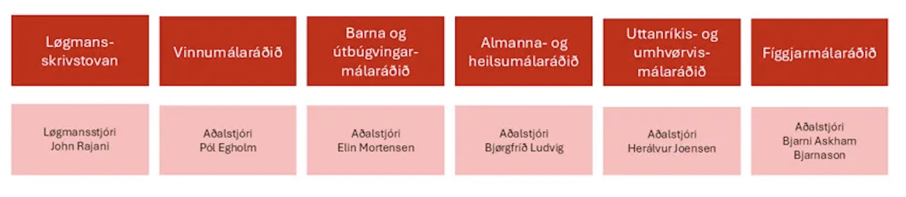 Nýskipanarnevndin mælir til, at nýggi bygnaðurin í landsfyrisitingini sær soleiðis út umframt Løgmansskrivstovuna: