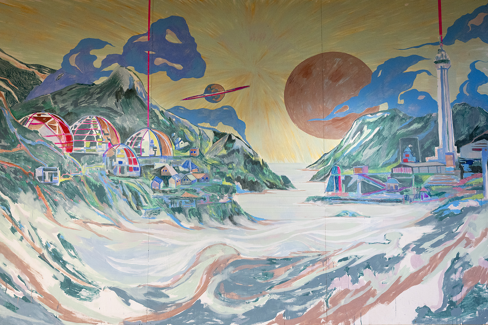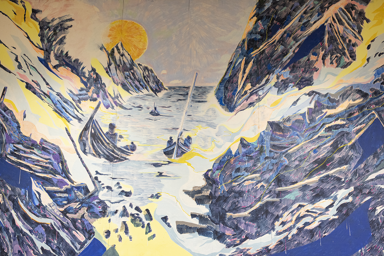 Myndirnar vera síðani leysari, minni defineraðar í miðjuni. Flótandi kroppar, svimjandi kroppar, sveimandi kroppar. Ljósreflektiónir og aldur, og streymur er rundan um fólkini. Miðjan er meira kensluborin og innanvend. Haraftrat er kompositiónin á myndini á eysturvegginum meira kompakt enn vinstrumegin. Súlur standa frammanfyri, so myndin verður deilt upp á tann háttin. Meðan vestursíðan er meira luftig. Á hendan hátt sipi eg beinleiðis til tekstin frá kunningini: “At kunna svimja undir himmalhválvinum móti óendaligu havsbrúnni – og at venda heim aftur til land okkara, ið hevjar seg grønt og bratt”. Men myndirnar avmynda eisini mínar egnu lívsroyndir, bæði sum listafólk og svimjari.”##med8##