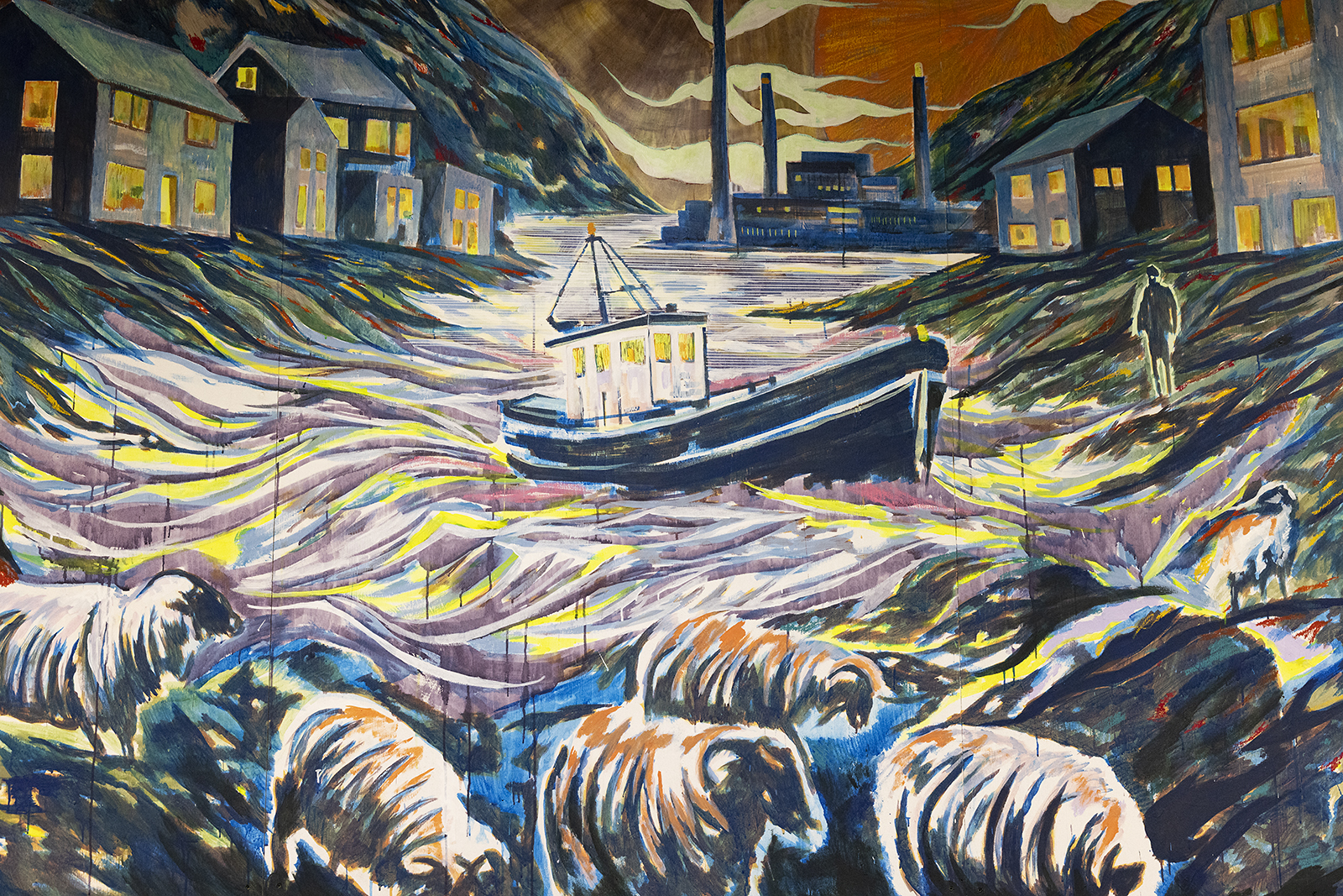“Myndirnar eru meira jørðnærar í báðum endunum. Kropparnir eru meira defineraðir, tættari at hvørjum øðrum. Har eru áskoðarar, fjepparar, fólk ið stuttleika sær, fólk ið reflektera. Her havi eg eisini málað mosa í mynstrum, sum hann veksur ymsastaðni í Føroyum. Og grót.