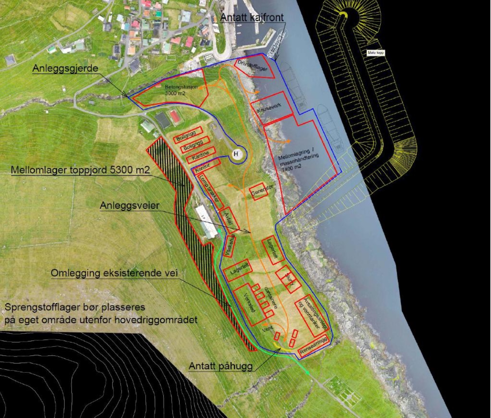 Roynd fakfólk hava gjørt uppskot til neyðugt byggipláss og fyribils havn, sum gerst rímiliga umfatandi, um loysnin skal vera forsvarlig til eina so stóra og avbjóðandi verkætlan. Hetta tilfarið er eisini gjøgnumgingið av fólkum við drúgvum royndum innan tunnilsgerð og stórum byggiverkætlanum.