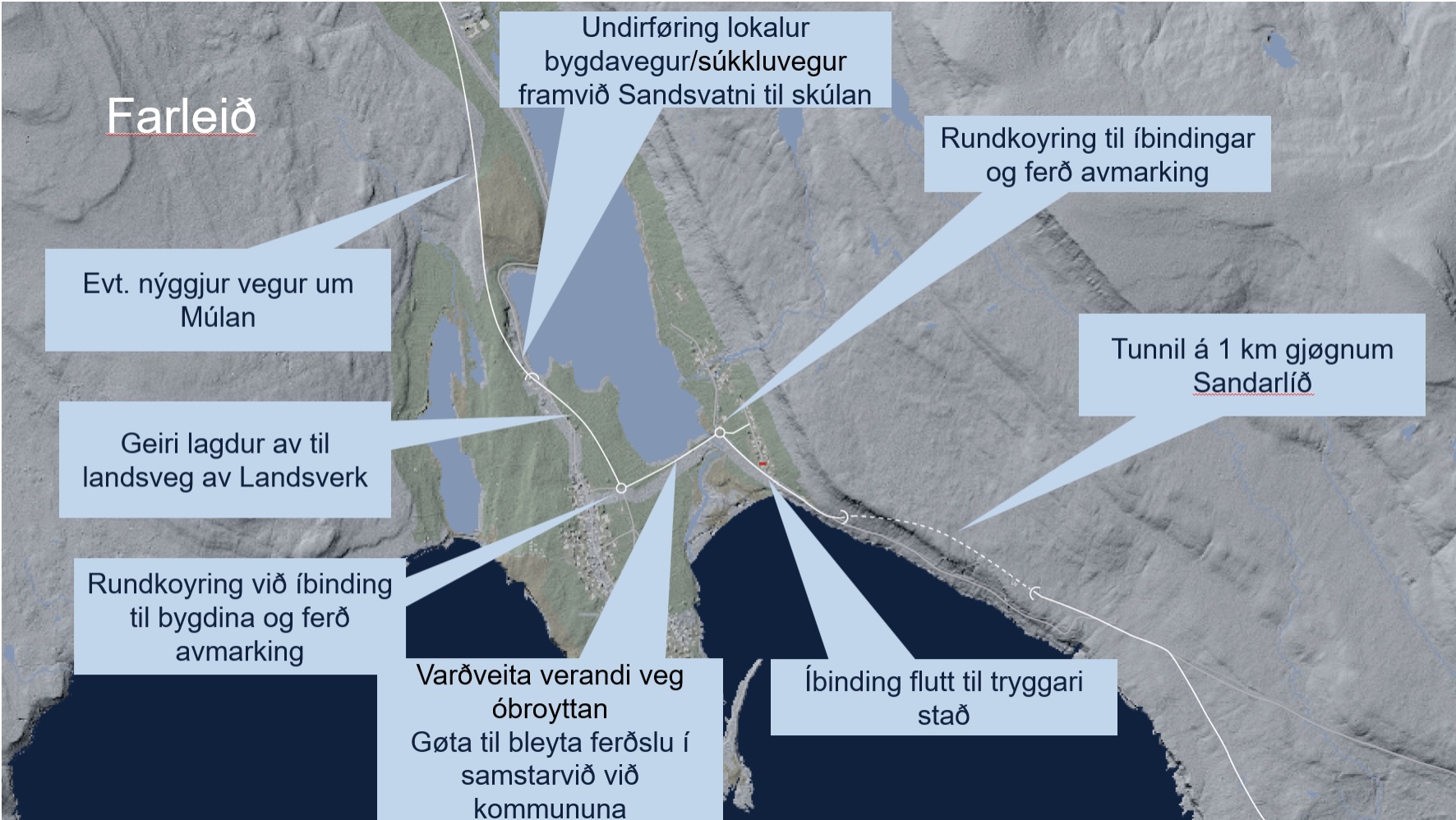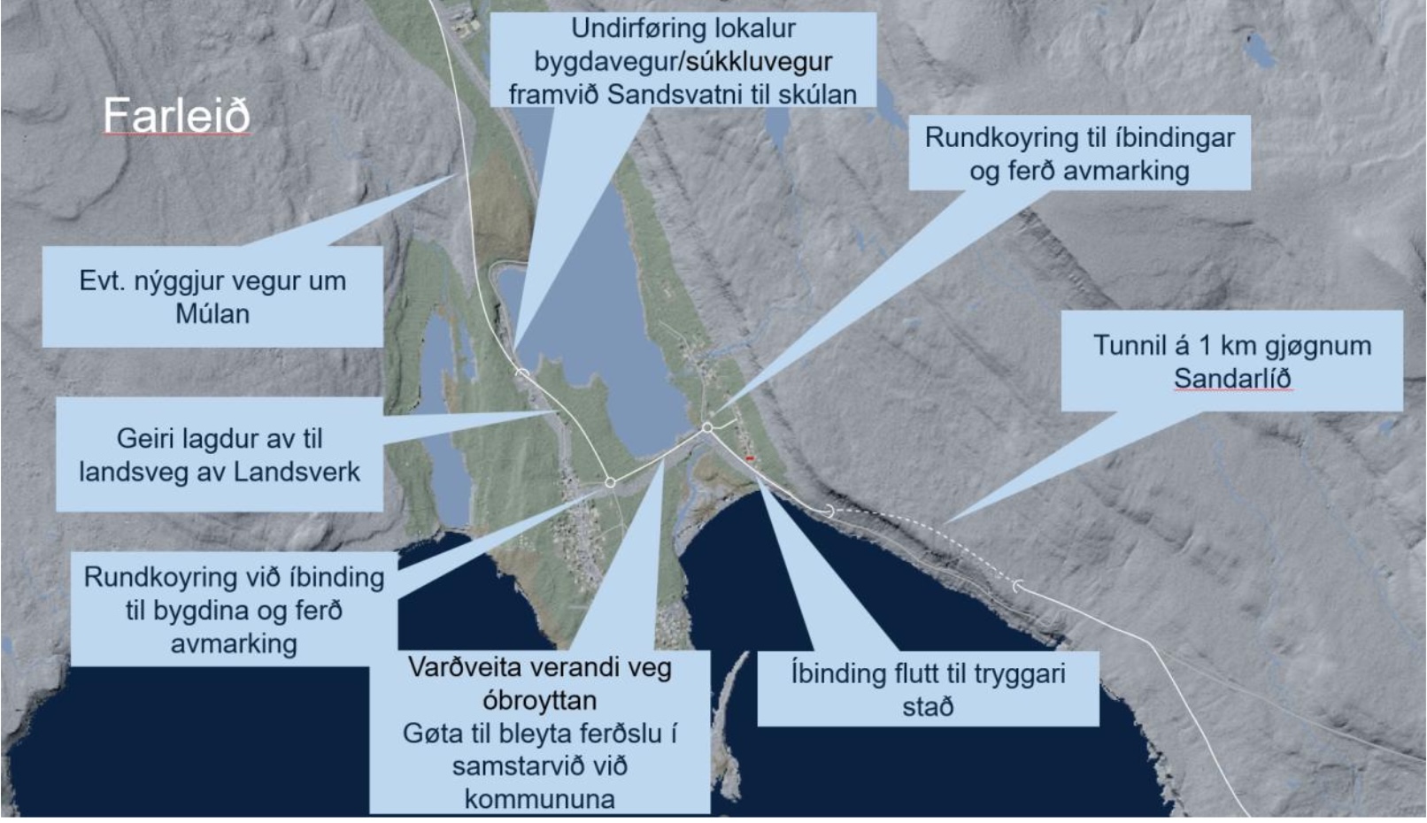 - Sandvík – Djúpadalur, við vegaføring til Sands Líð, tunnil gjøgnum Sands Líð og vegaføring gjøgnum Sands bygd, sum verður bundin í landsvegin norðanfyri Meginskúlan.