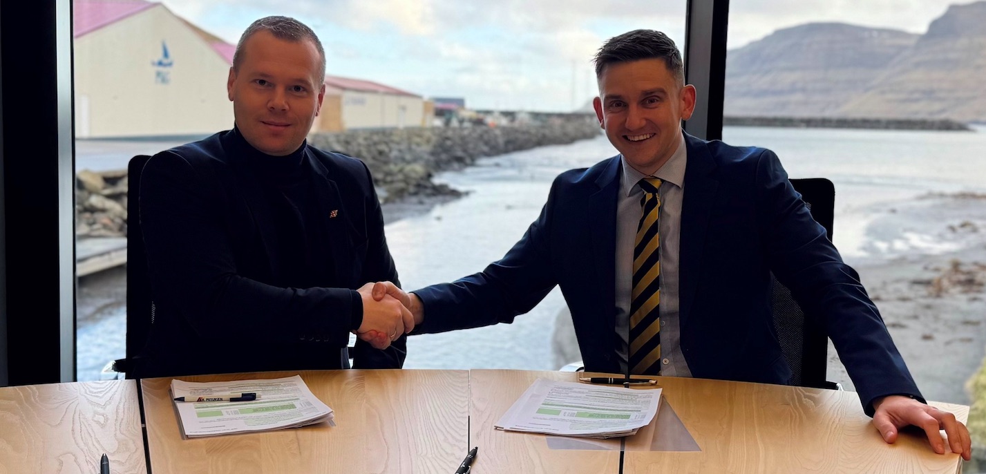 Borgarstjórin, Per Martin Gregersen, og Sigtór Petersen, stjóri í J&K Petersen, skrivaðu undir sáttmálan í býráðshúsinum í dag.