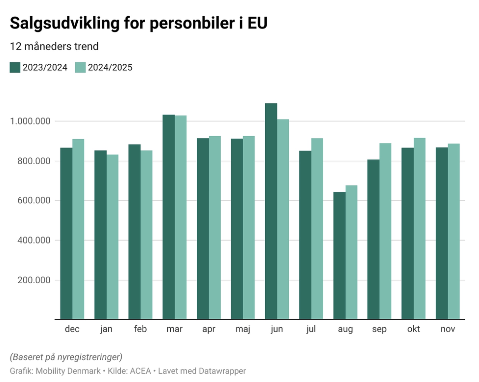 Í november vóru 887.491 nýggir persónbilar skrásettir á ES-bilamarknaðunum. Tað svarar til ein lítlan vøkstur á 2,1 prosent í mun til sama mánað í fjør, og november var sostatt enn ein mánaður við vøkstri í talinum av nýggjum skrásetingum í ES. Higartil í ár eru 9.860.092 nýggir persónbilar skrásettir í ES, sum er støðugt í mun til støðið frá 2024, við einum lítlum vøkstri uppá 1,4 prosent.