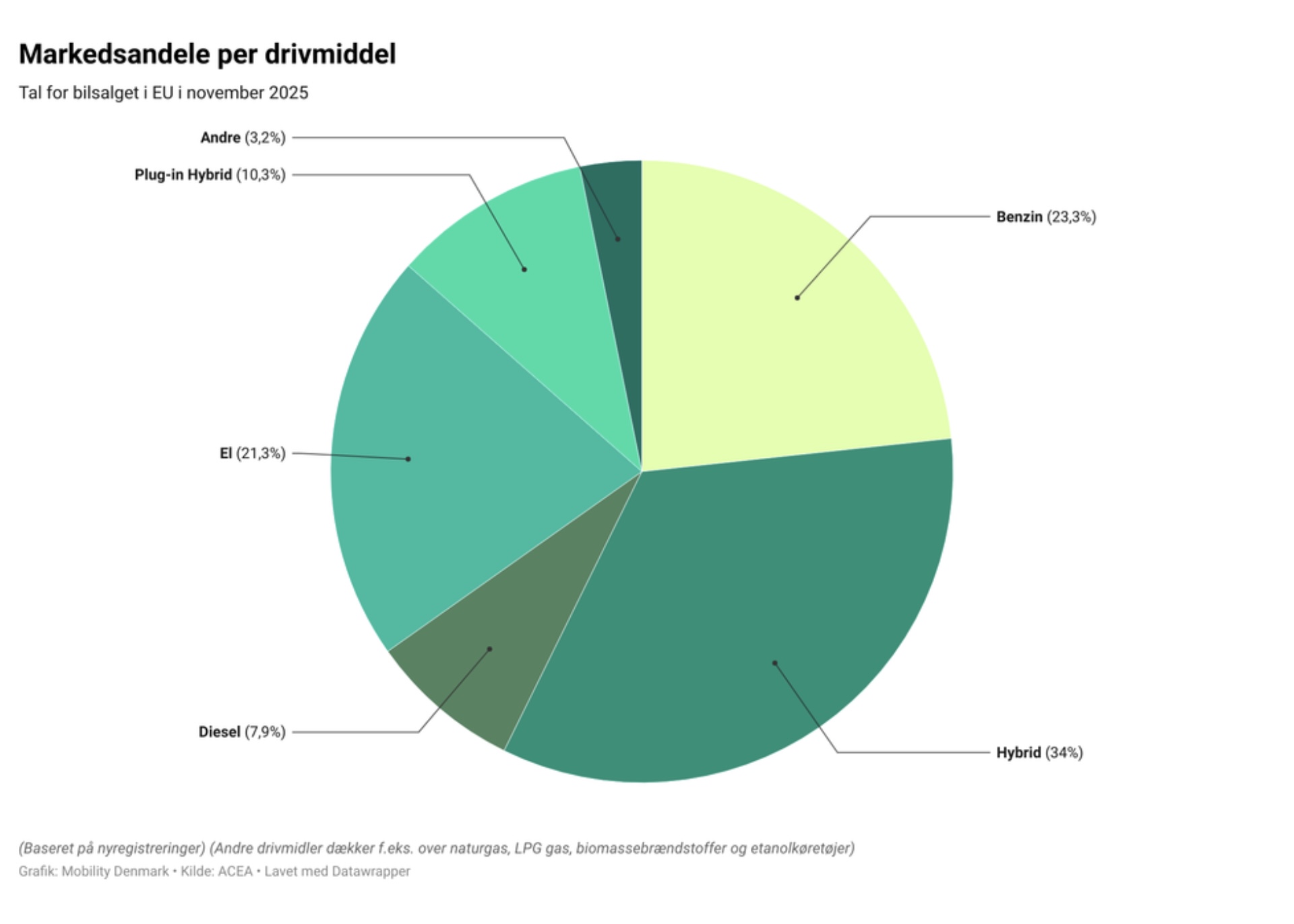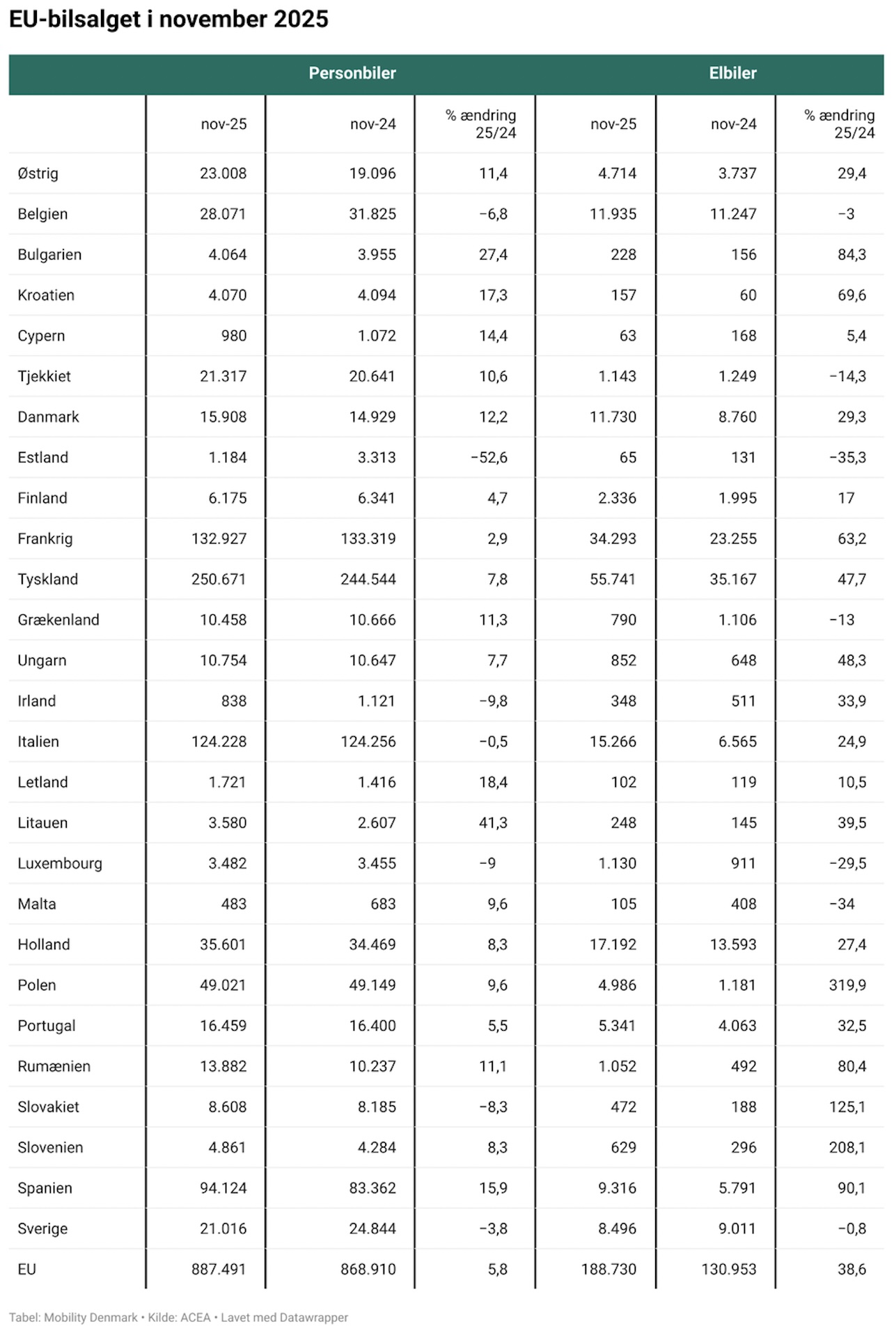 Elbilar vóru eisini eyðkendir av framgongdini í november. Í mánaðinum vórðu 188.730 el-persónbilar skrásettir, sum er ein vøkstur uppá 44,1 prosent í mun til november 2024. Elbilar vóru sostatt 21,3 prosent av ES-marknaðinum í november – tað er meira enn ein av fimm nýggjum bilum.