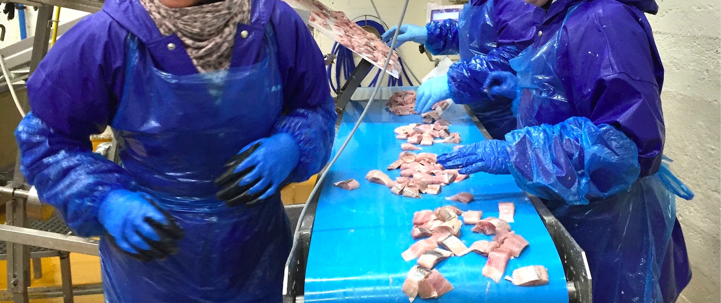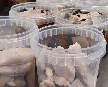 - Her verður sildin flakaskorin og skorin í bitar. Síðan verða bitarnir latnir í tunnur og marineraðir.