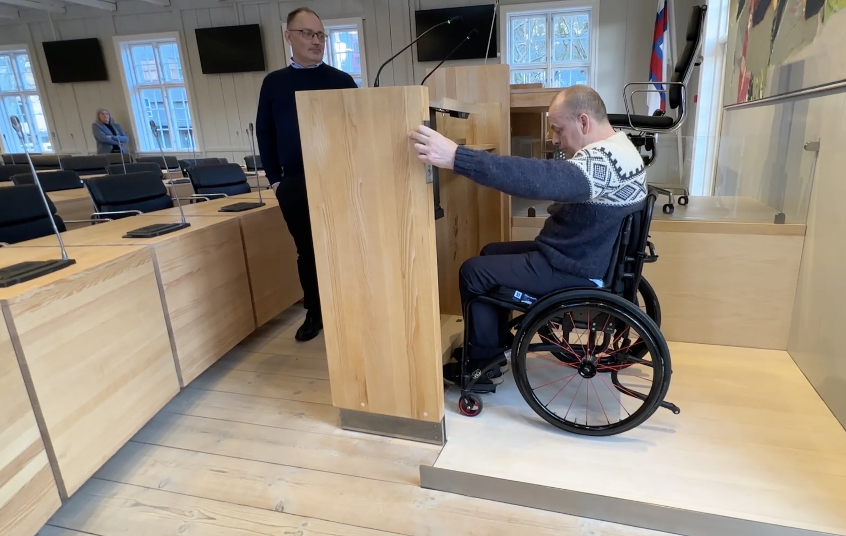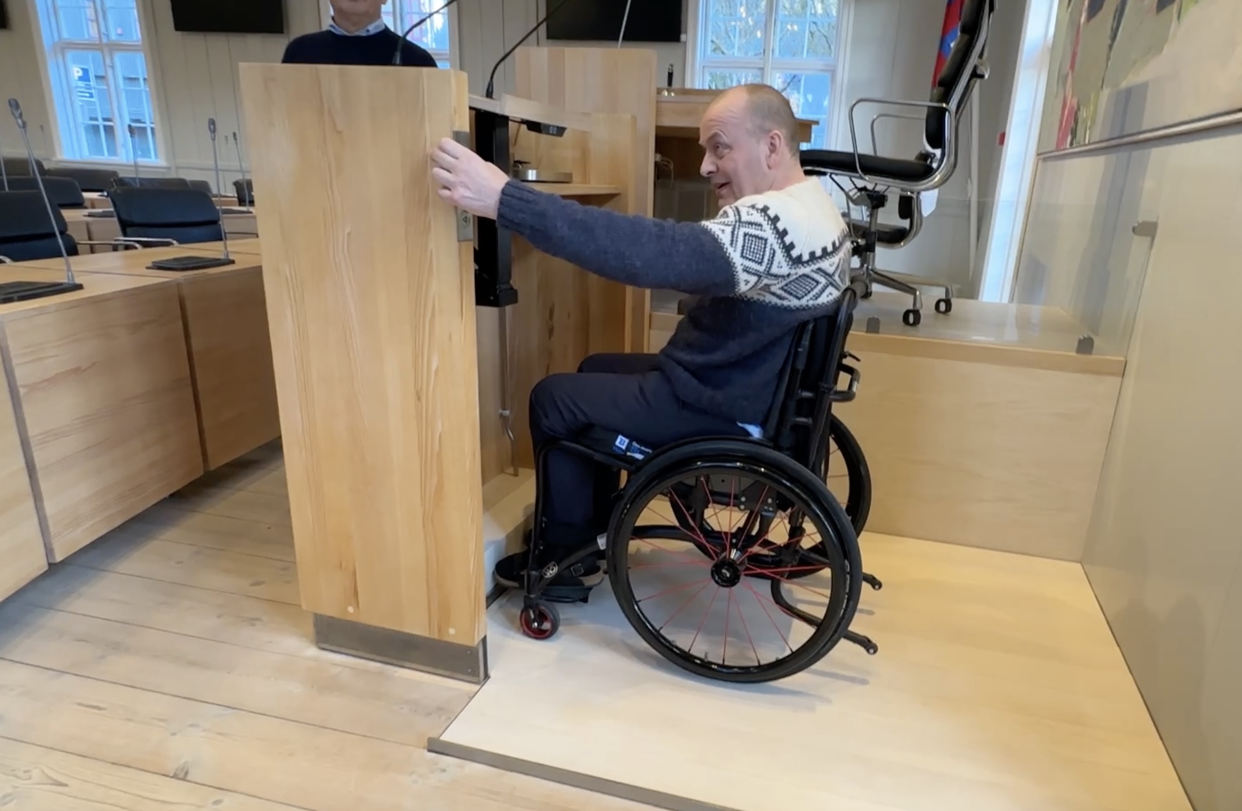 Arbeiðið hevur verið darvað, tí tað eru ikki so nógvir veitarar, sum kunnu gera arbeiðið, og tí at ymsar tekniskar broytingar skuldu gerast í kjallaranum, tí at ventilatiónsskipanin lá beint undir røðarapallinum. Men nú er arbeiðið gjørt, og nú kunnu rørslutarnað í koyristóli nýta røðarapallin – men ikki nóg mikið við tí. Tað er eisini gjørt soleiðis, at tað slepst eisini upp á formanspallin við lyftini. So um ein persónur við rørslutarni gerst løgtingsformaður, so er atkomuligheitin heldur ikki longur ein trupulleiki.