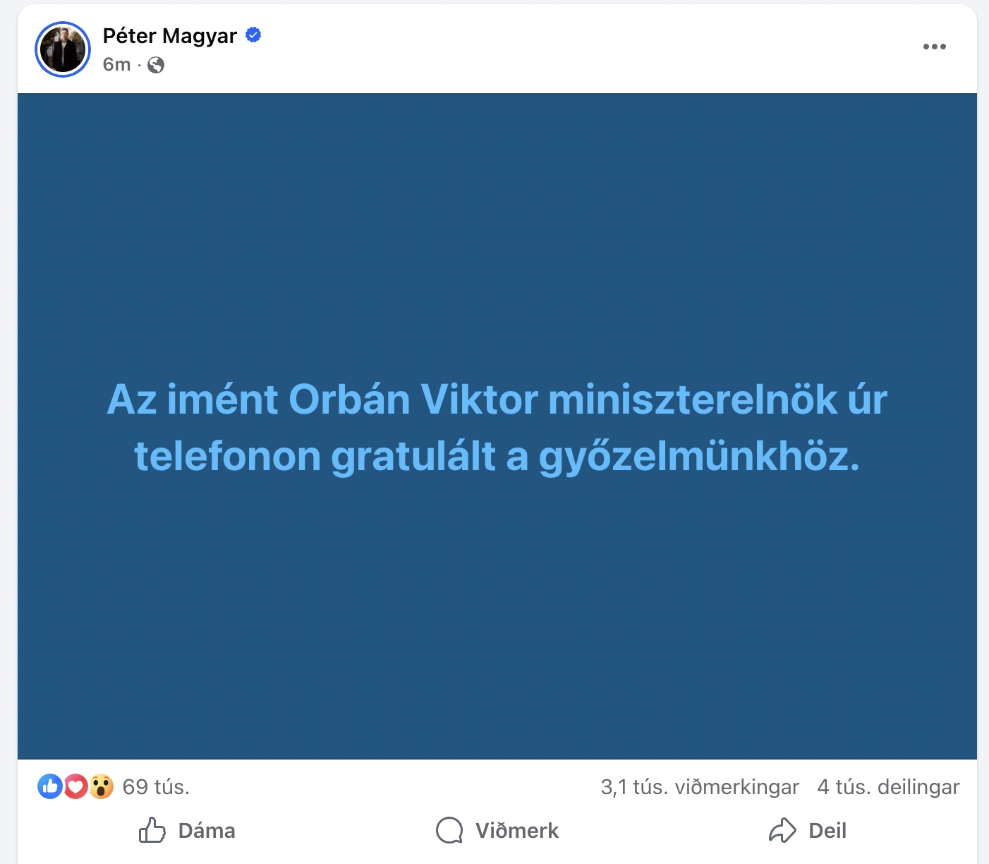 Viktor Orbán, forsætisráðharri í Ungarn, hevur í kvøld ringt til andstøðupolitikarin Péter Magyar og yngst honum tillukku við sigrinum.