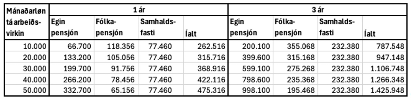 Um pensjónsaldurin hækkar trý ár, tekur samgongan rættin til 1.106.748 krónur frá einum miðalløntum løntakara, sum hann annars hevði fingið útgoldið frá eginpensjón, fólkapensjón og samhaldsfasta. Afturat hesum skal hesin løntakarin arbeiða trý ár afturat og gjalda 456.249 krónur í inntøkuskatti, avgjøldum og pensjónsforskatting.
