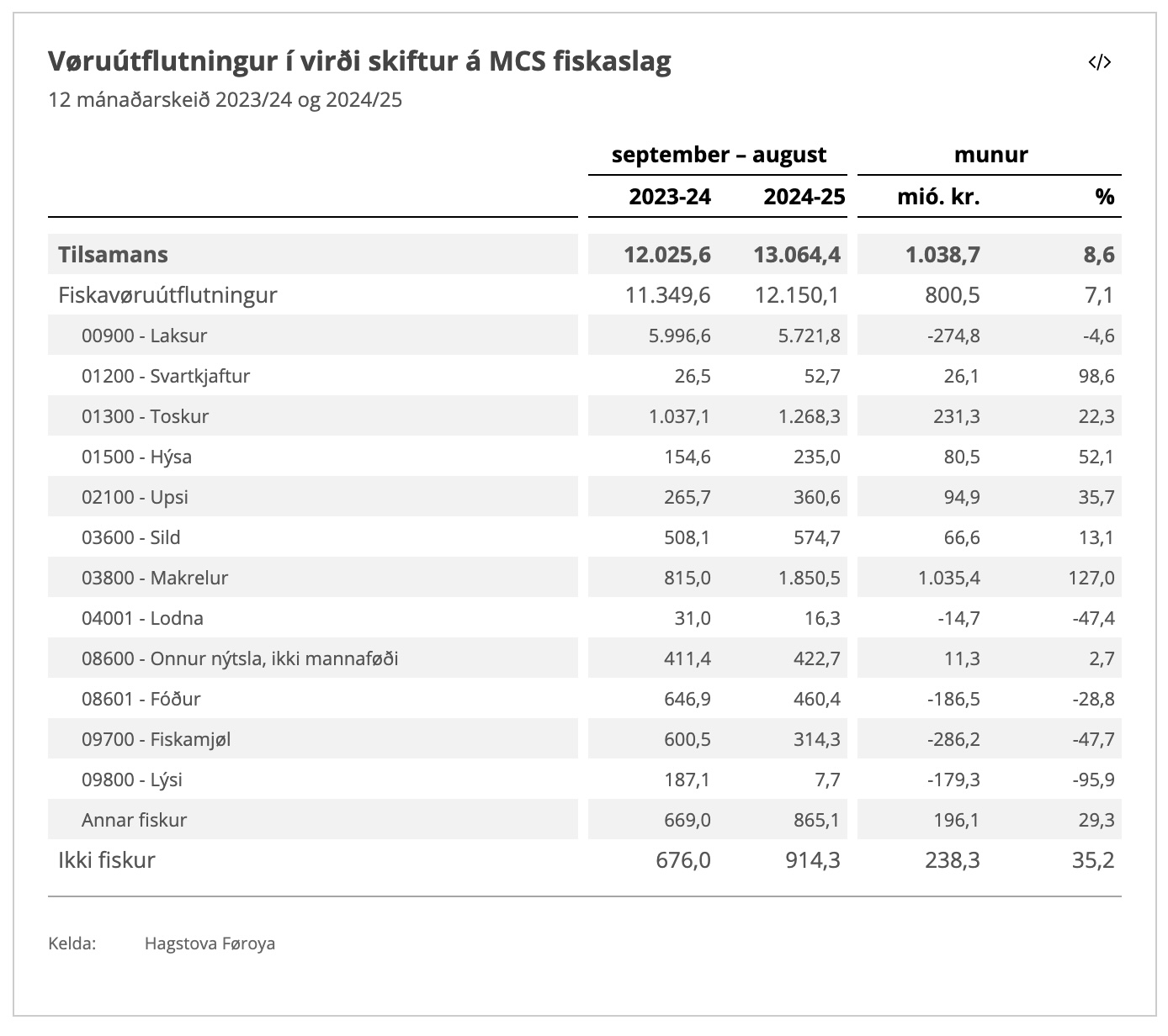 Tað er ein góð milliard krónur meira enn undanfarna skeið. Útflutningsvirðið av makreli er somuleiðis vaksið við einari góðari milliard krónum.