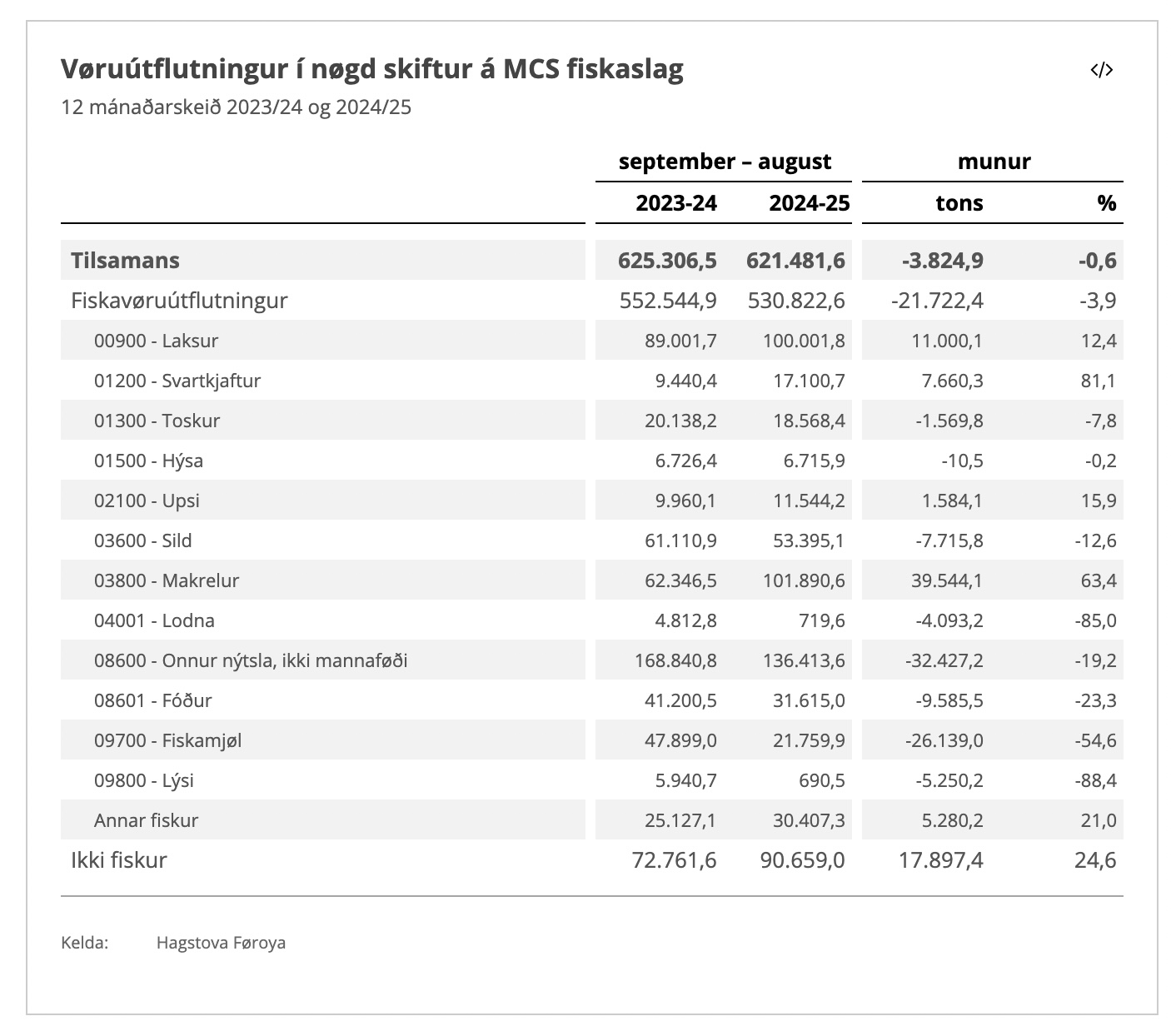 Útflutningurin fyri august er nú gjørdur upp, og í talvunum niðanfyri ber til at síggja útflutningin fyri tíðarskeiðið september 2024 til august 2025 samanborið við undanfarna tíðarskeiðið.