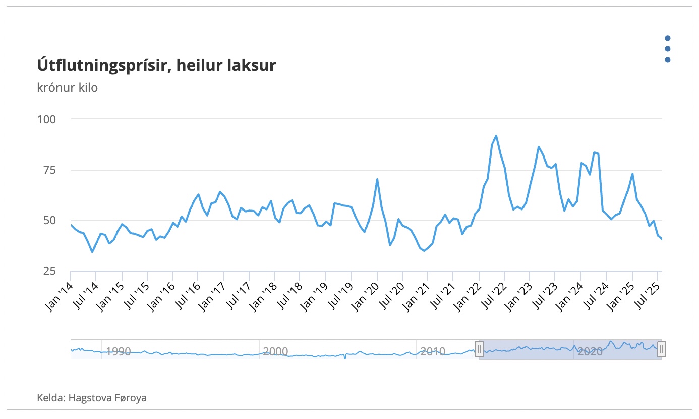 Prísurin á laksi hevur verið sera svingandi síðani byrjanina av 2022. Prísurin á heilum feskum laksi hevur hetta tíðarskeiði ligið millum umleið 50 og 90 krónur kilo. Í august í 2024 var prísurin 50,40 krónur kilo og í august í ár er prísurin 40,50 krónur kilo. Hetta er ein lækking á nærum 20 prosent
