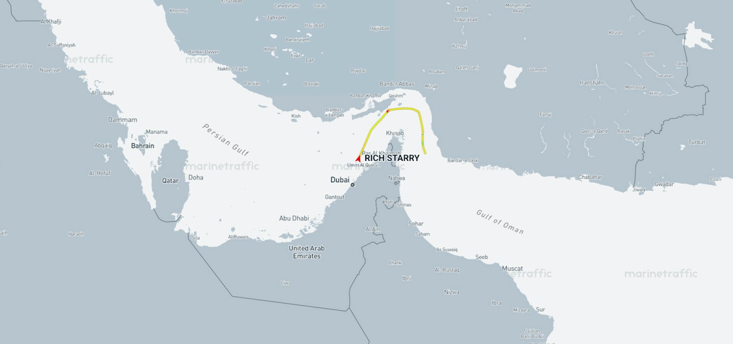 Reuters veit at siga, at kinesiska tangaskipið, Rich Starry, er eitt miðalstórt skip, sum er lastað í Hamriyah í Sameindu Arabisku Emiratunum.