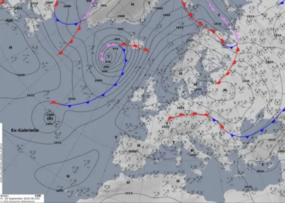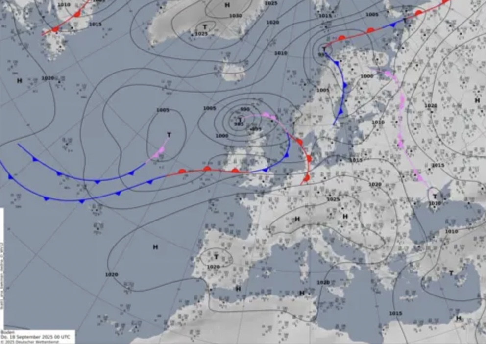 Sum sæst á permumyndini omanfyri, so lá eitt lágtrýst beint vestan fyri Skotland um mánaðarskiftið august/september og sendi slavna luft inn yvir Føroyar av landsynningi. Eitt samanrunnið brúgvalag var júst farið fram við Føroyum og ferðaðist síðani longur norðureftir, áðrenn tað hæsaði av.