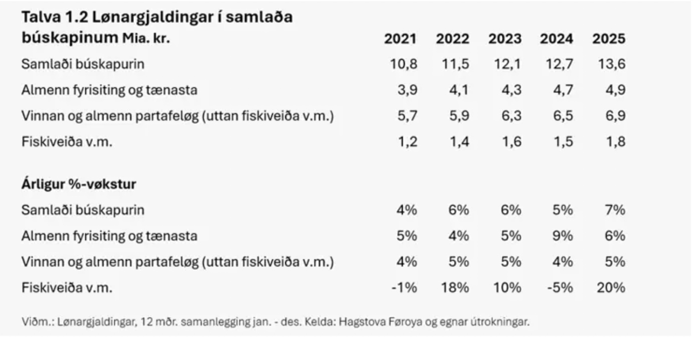 Árligi vøksturin í samlaðu nominellu lønargjaldingunum hava ligið millum 4% og 7% frá 2021 til 2025. Tað eru fleiri orsøkir til vøksturin í lønargjaldingunum seinastu árini; millum annað lønarhækkan, at summir starvsbólkar hava fingið lønarlyft, og at tað hevur verið vøkstur í starvsfólkatalinum. Vøksturin í lønargjaldingunum hevur í vinnuni og almennu partafeløgunum verið rættiliga støðugur í tíðarskeiðinum 2021 til 2025; millum 4-5%. Gongdin í tí almenna er ikki heilt hin sama, talva 1 vísir, at vøksturin var slakari í 2022 og 2023 (4% og 5%), enn í 2024 og 2025, tá ið vøksturin í lønargjaldingunum var ávikavist 9% og 6%.