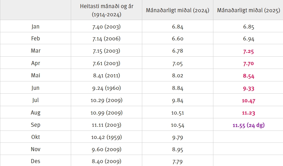 Talva 1. Heitastu mánaðir á Landgrunninum, mátað við Mykines (1914-1969) og Oyrargjógv (1991-2024) (fyrsta linja). Mánaðar miðalhitin í 2024 og higartil í 2025 við Oyrargjógv eru víst á aðru og triðju linju, har nýggju metini eru við reyðum. Legg til merkis, at fyri septembur 2025 resta 6 dagar í, og tískil er hetta ikki endaliga virðið.