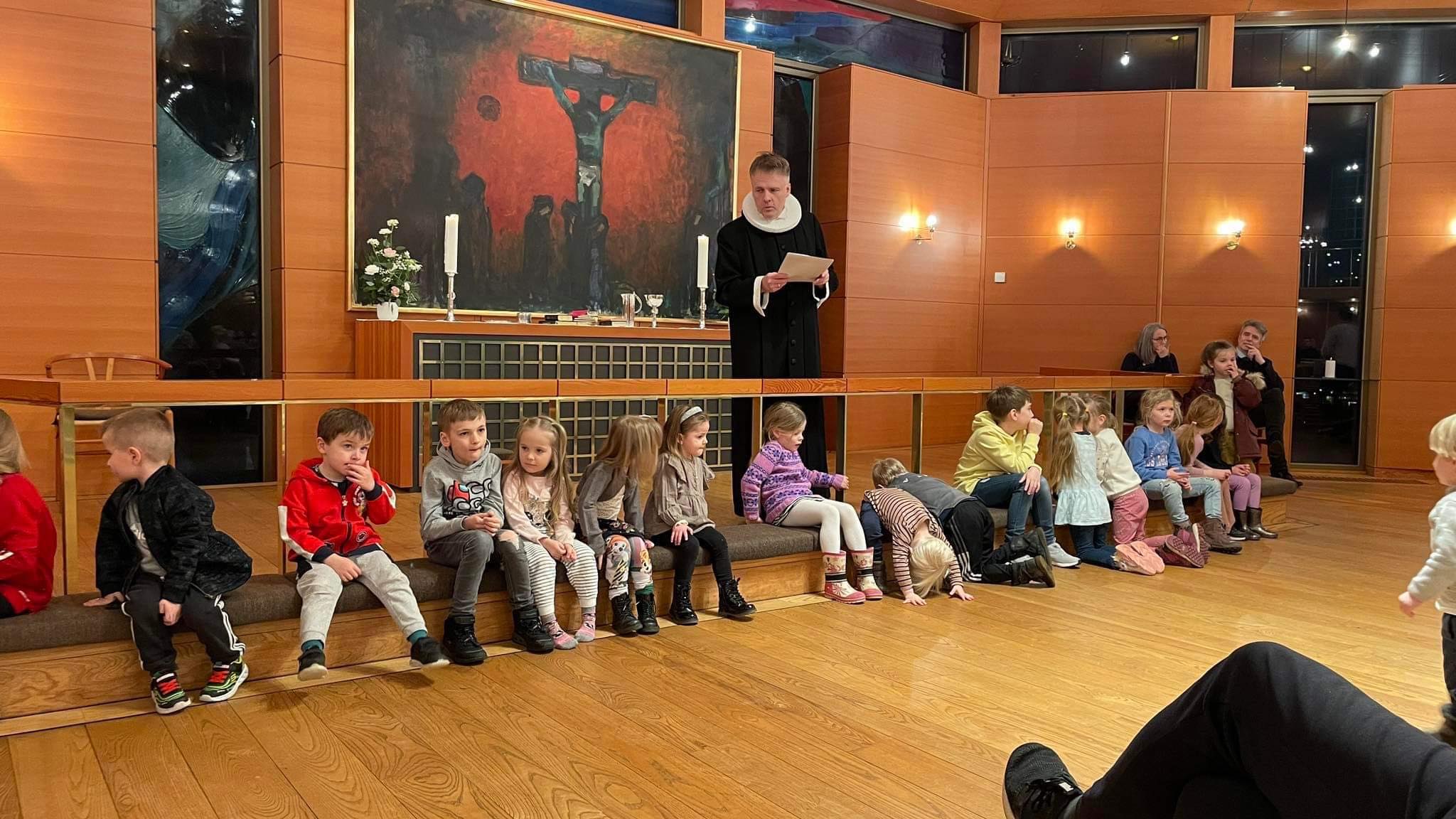 Prestur sigur frá, og børn og vaksin eru saman um eina góða bíbliusøga. Síðani verður niður undir í Kirkjukjallaran til ein góðan bita av lasanju.