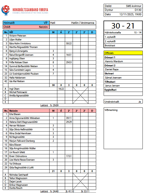 HER ber til frá HSF at síggja dómaraseðlarnir frá dystunum, ið vóru leiktir í SMS-deildini í kvøld: