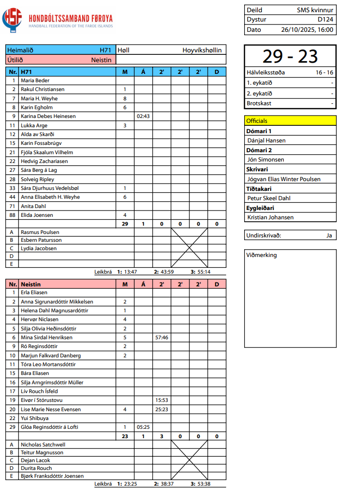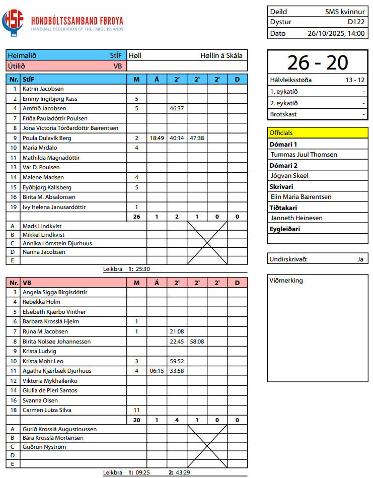 HER ber til frá HSF at síggja dómaraseðlarnar frá dagsins dystum í SMS-deildini: