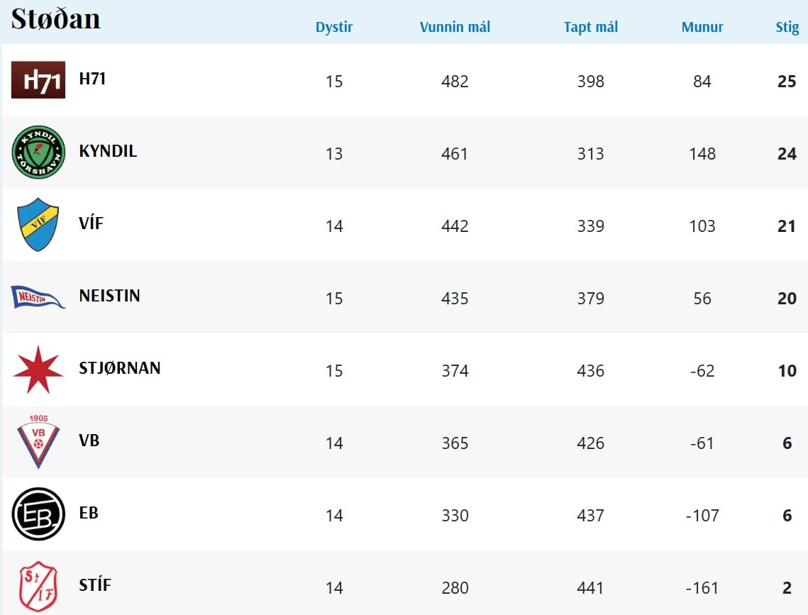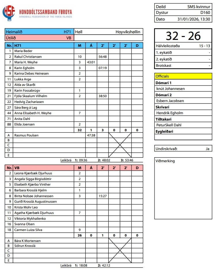 HER ber til frá HSF at síggja dómaraseðilin frá dystunum millum H71 og VB, umframt støðuna í deildini: