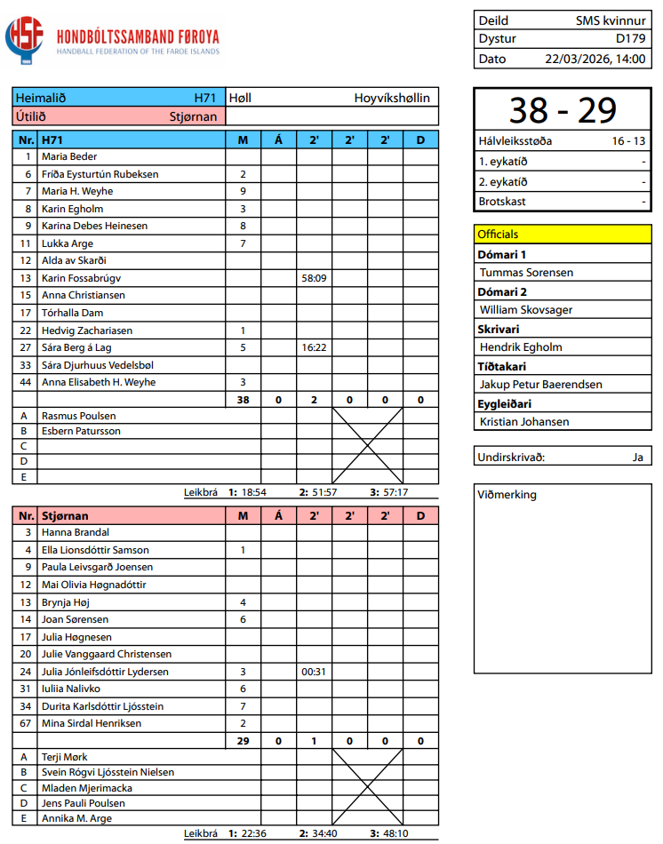 HER ber til frá HSF at síggja dómaraseðilini frá dystinum millum H71 og Stjørnuna, umframt støðuna í deildini: