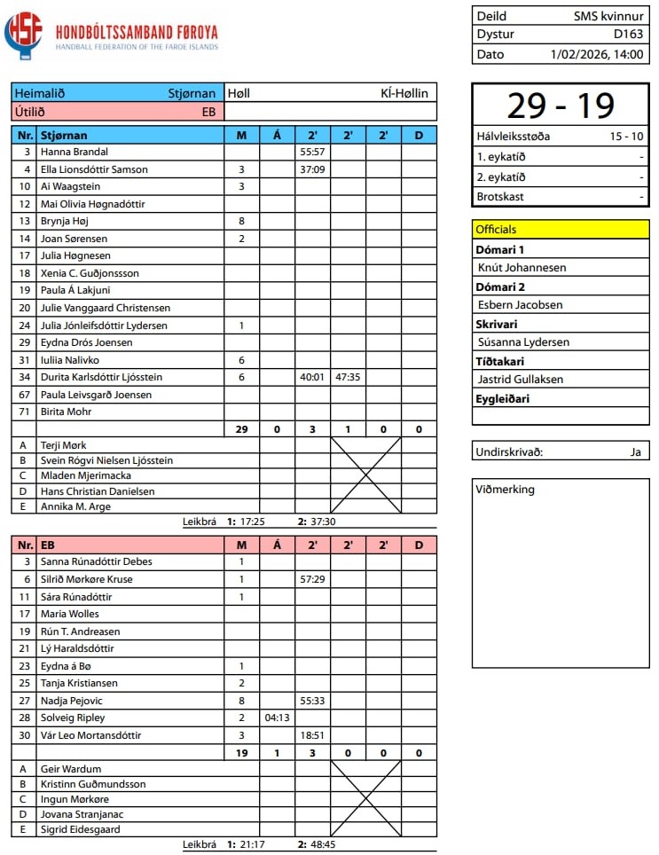 Í KÍ-høllini í Klaksvík vann Stjørnan 29-19 á EB. Klaksvíkskvinnur vóru á odda 15-10 í steðginum.