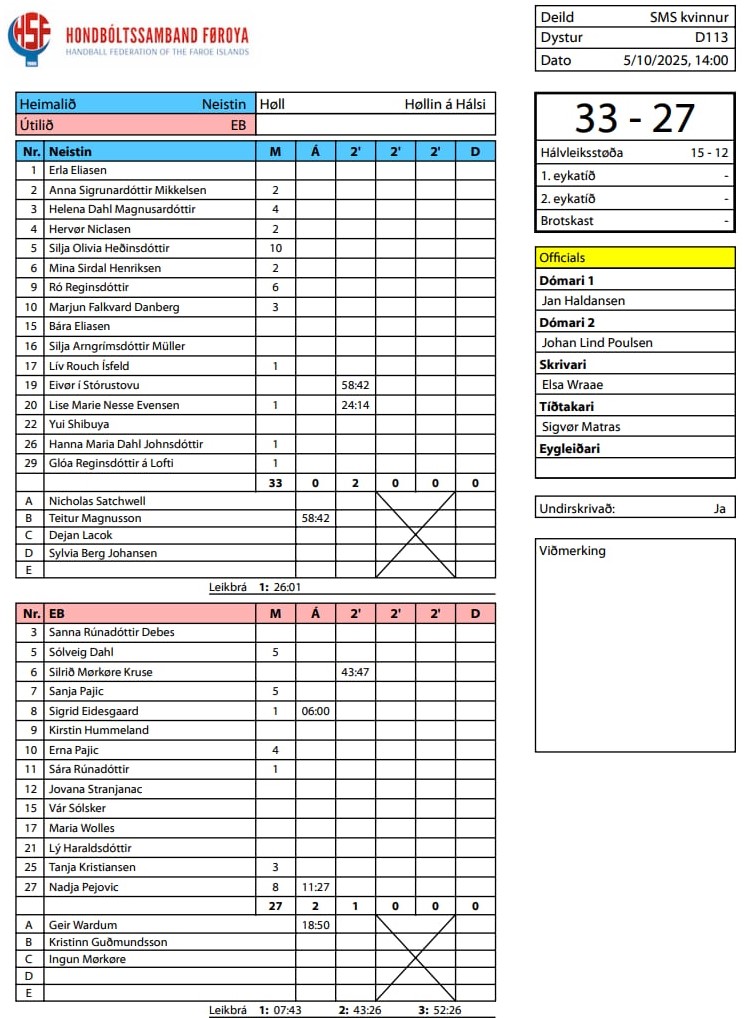 Í høllini á Hálsi í Havn eydnaðist tað Neistanum at vinna 33-27 á EB. Í steðginum vóru neistakvinnur á odda 15-12.