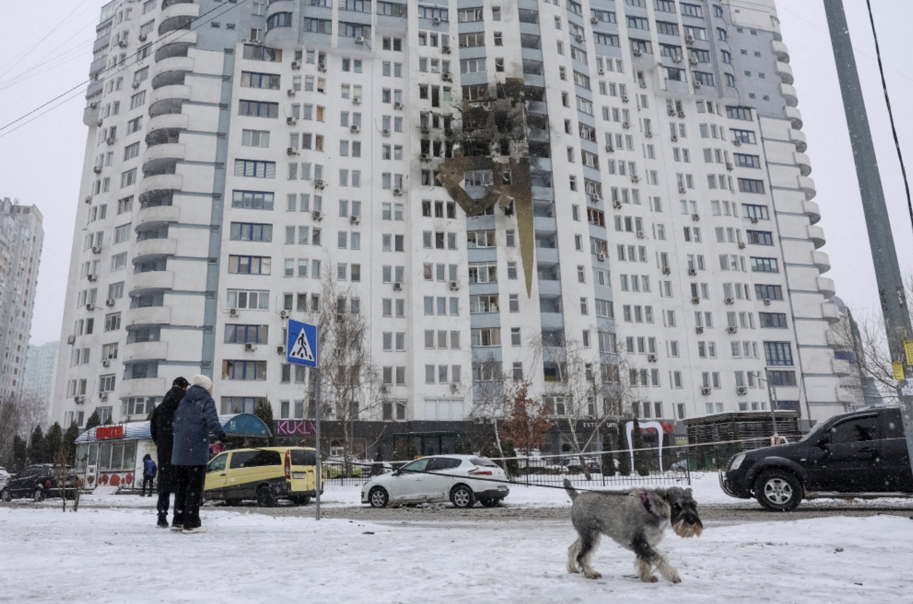 Ein russisk drona rakti fríggjadagin á ein íbúðarbygning í ukrainska høvuðsstaðnum, Kiev. Sambært borgarstjóranum í býnum eru nógvir íbúðarblokkar uttan hita eftir álop á streymveitingina í býnum. - Mynd: Anatolii Stepanov
