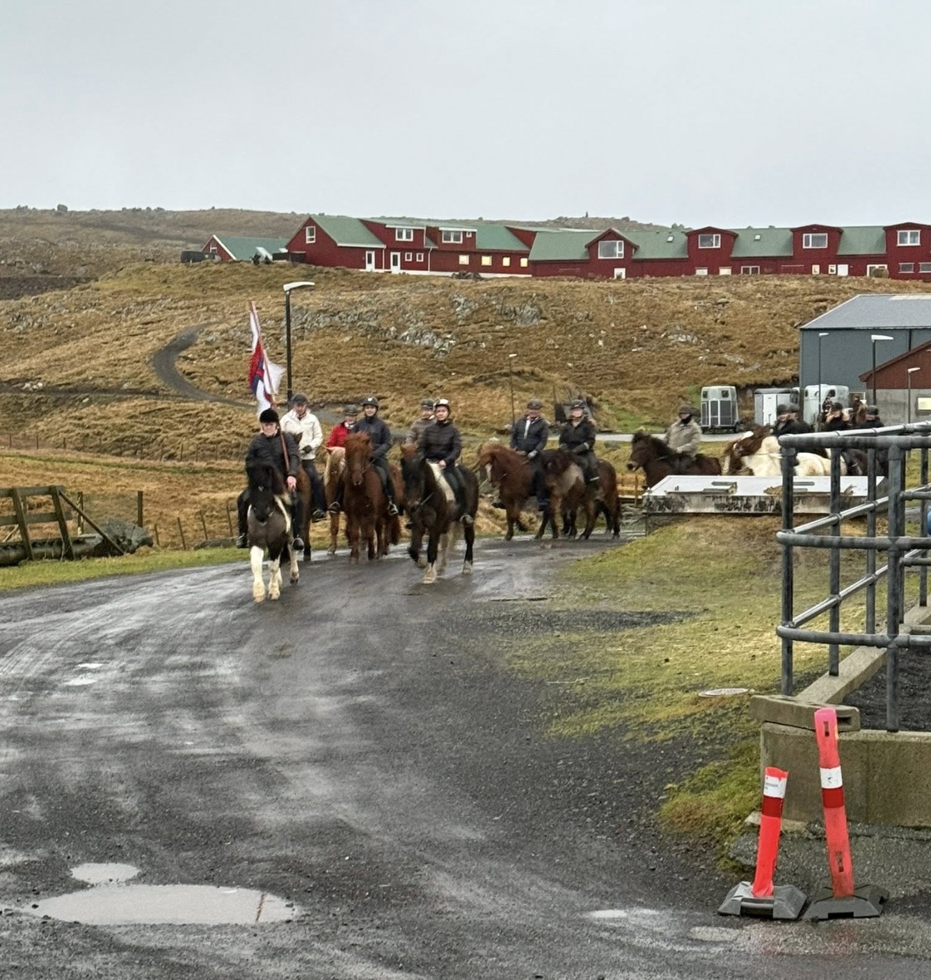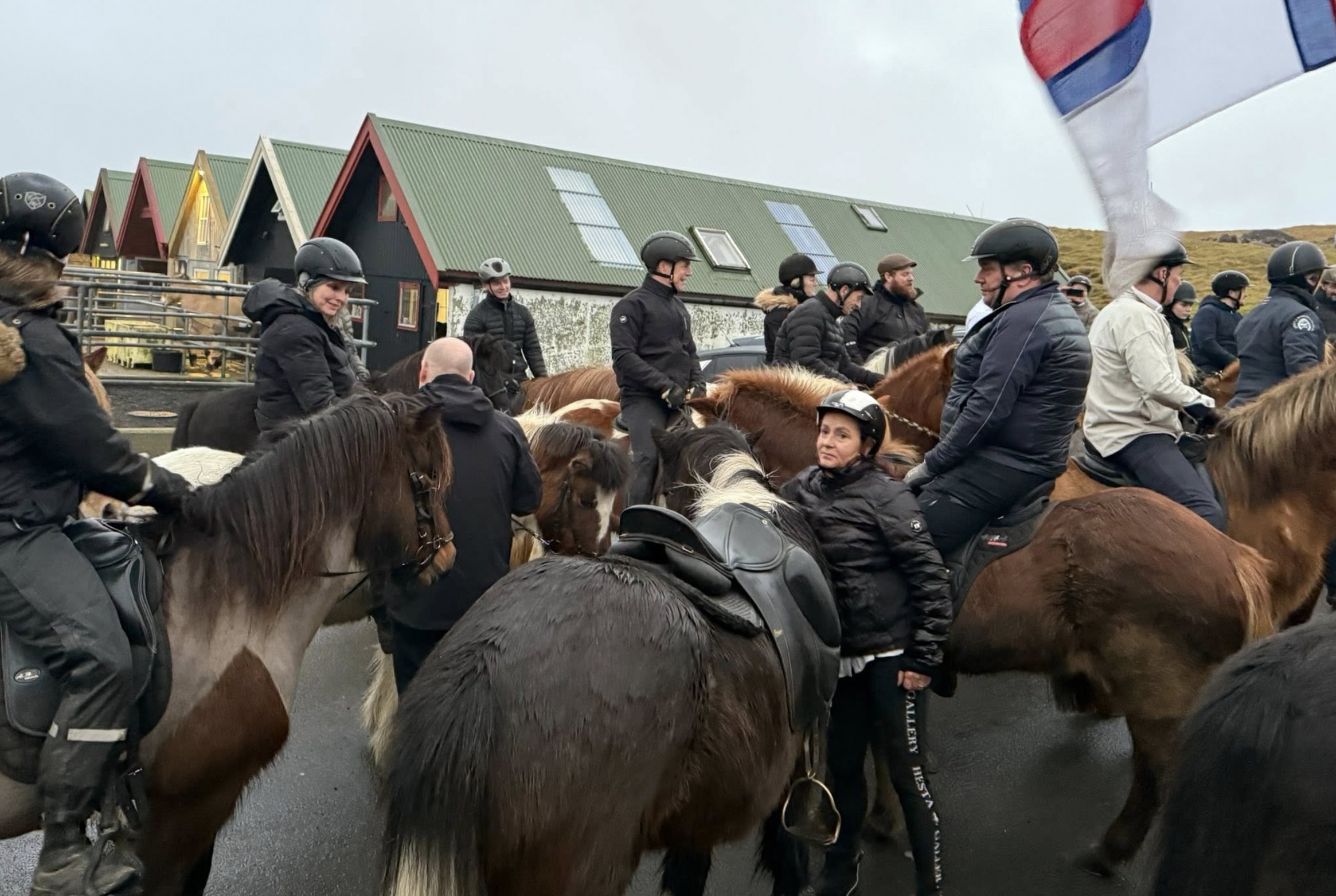 Ríðumenn og kvinnur, eini 50 í tali, skipaðu fyri ríðugongu fyri Svenning, sum tók í móti við heilsan og sungi var fyri honum, til lukku til tín.