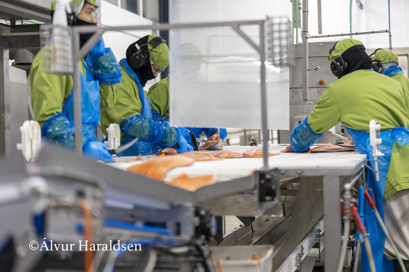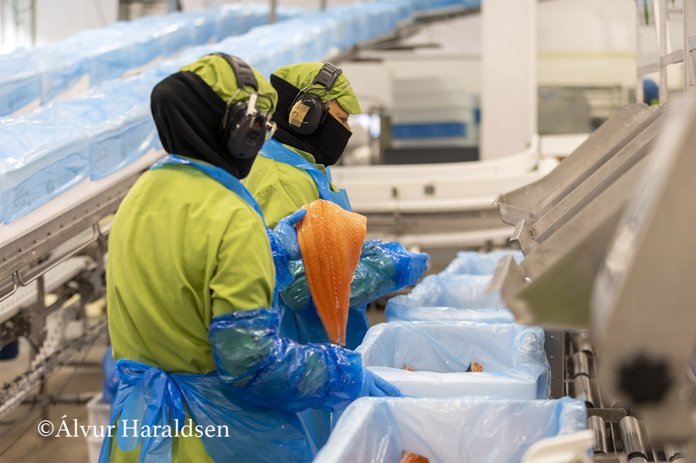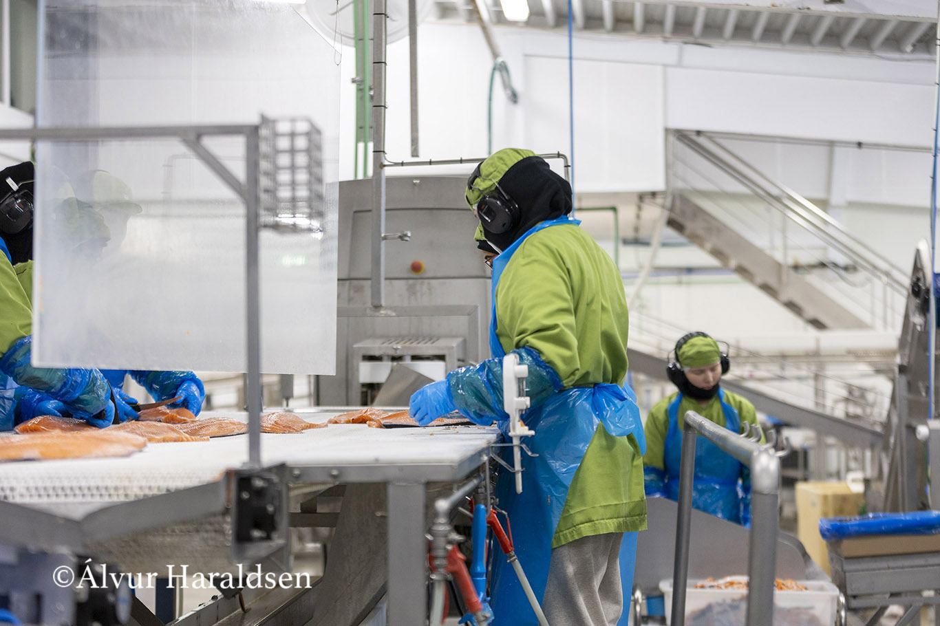 Guðrið Falkvard Joensen hevur arbeitt á laksavirkinum hjá Hiddenfjord í næstan trý ár. Hon arbeiðir við pakking. Laksurin verður býttir upp í stødd, og síðani koyrdur til prentaran. Tá tann sum arbeiðir fast í prenaranum fer í steðg, loysir Guðrið av. Í prentaranum vera eskjurnar vigaðar, og stødd, vekt, og nøgd verður prenta út. Síðani fara eskjurnar til avskiping. Mangla fólk arbeiðir Guðrið eisini í vakum, og onkuntíð sker hon, men allar oftast stendur hon við pakkibandið.
