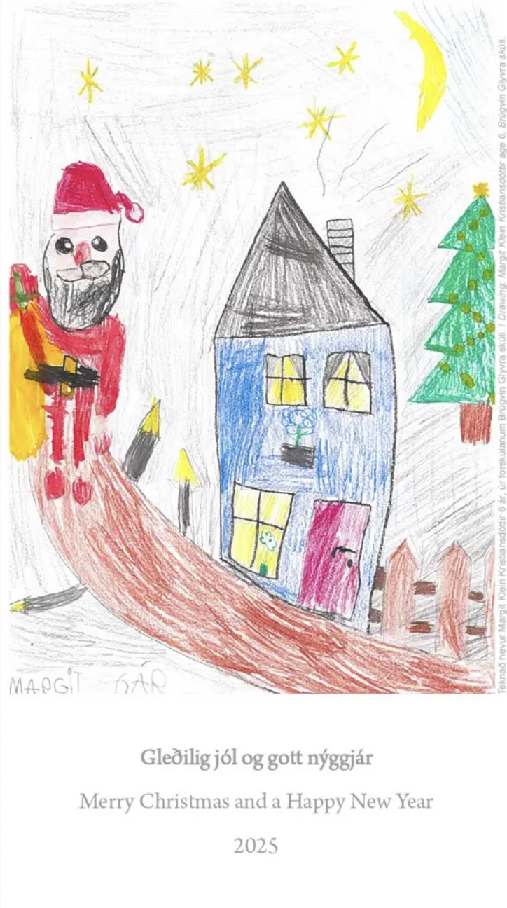 6 ára gamla Margit Klein Kristiansdóttir, sum gongur í forskúla í Glyvra skúla, hevur teknað jólakortið, sum Barna- og útbúgvingarmálaráðið hevur brúkt í ár. Djóni Nolsøe Joensen, landsstýrismaður, er fegin um, at skapandi evnini hjá børnum eisini kunnu brúkast í hesum sambandi.