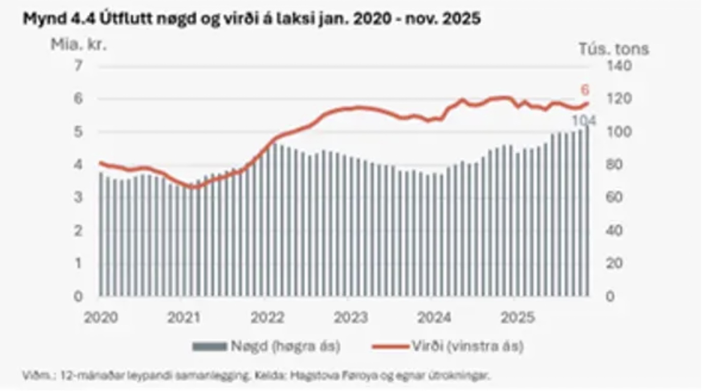 Eisini fyri 2026 væntast ein vøksur í alvinnuni bæði í prísi og nøgd, tí væntast at eisini í 2026 fer útflutningsvirðið av laksi at økjast.