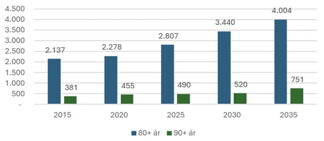 Talið av 80+ ára gomlum byrjar at vaksa munandi komandi árini, sí myndina niðanfyri. Orsøkin er øktur livialdur, og harafturat at fleiri stórir árgangir gerast 80+ ára gomul. Talið av 80+ ára gomlum fer at vaksa úr 2.800 fólkum í 2025 til 4.000 fólk í 2035, ein vøkstur á sløk 45%.
