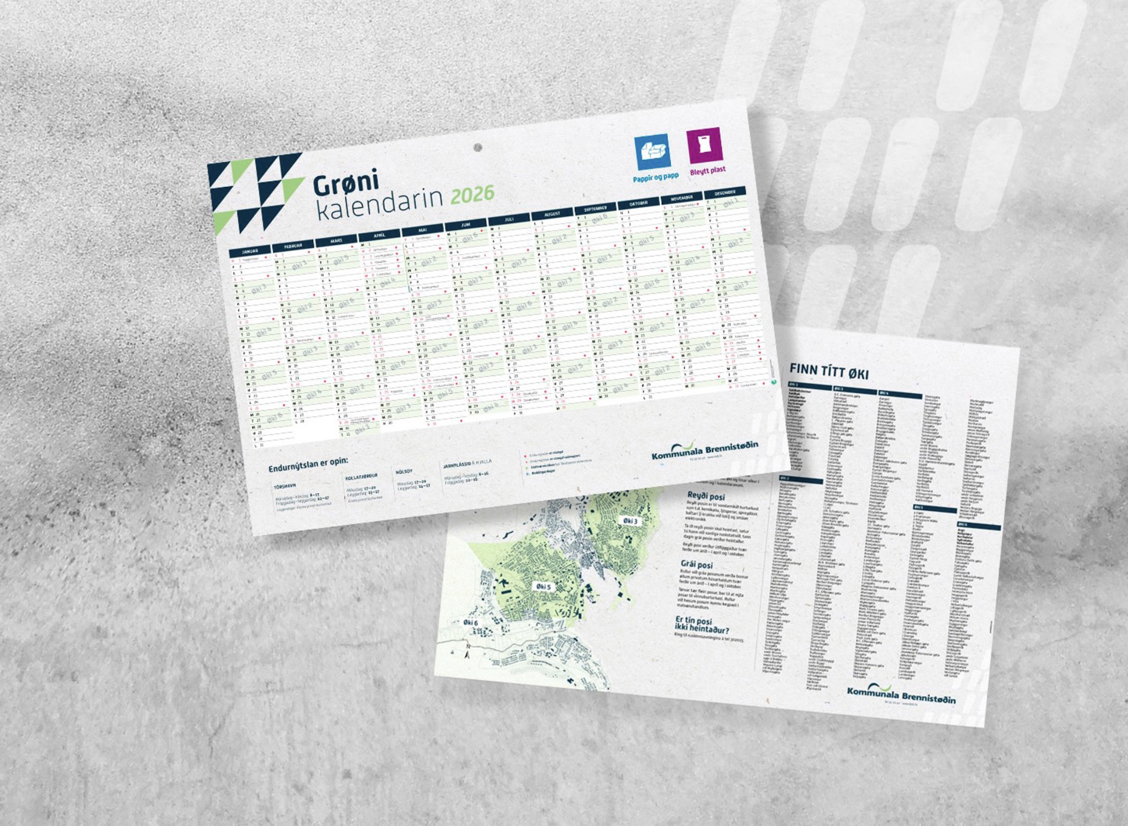 Grøni kalendarin fyri 2026 er komin. Í kalendaranum sært tú, hvørja viku títt grøna ílat verður tømt. Tú kanst taka grøna kalendaran niður í talgildari útgávu frá heimasíðuni hjá Kommunalu Brennistøðini.