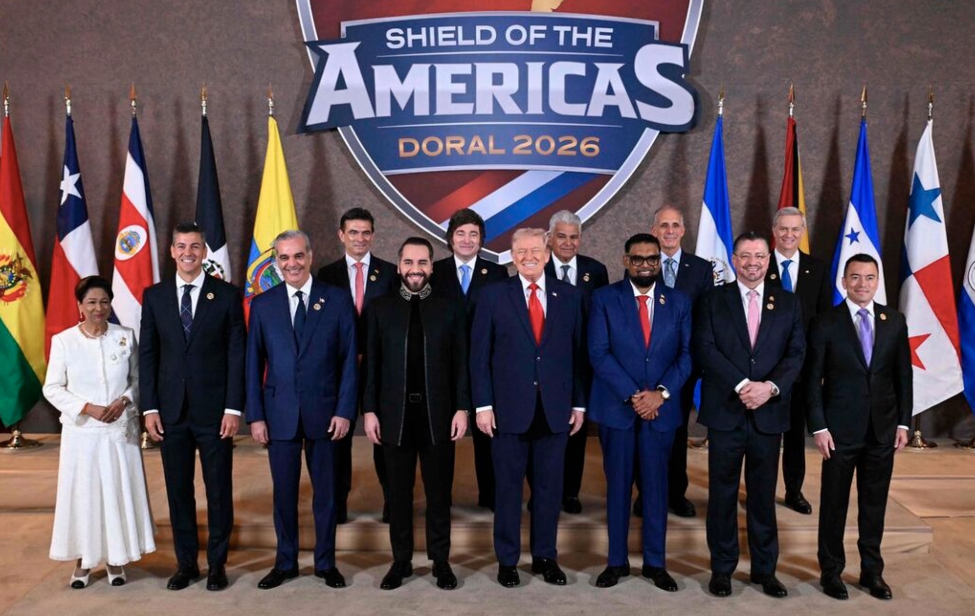 Amerikansk forsetin Donald Trump (C) stands with, (L/R), Trinidad and Tobagos Prime Minister Kamla Persad-Bissessar, Santiago Peña, President of the Republic of Paraguay, Luis Abinader, President of the Dominican Republic, Rodrigo Paz Pereira, President of Bolivia, Nayib Bukele, President of El Salvador, Javier Milei, President of Argentina, José Raúl Mulino, President of Panama, Mohamed Irfaan Ali, President of Guyana, Nasry "Tito" Asfura, President of Honduras, Rodrigo Chaves Robles, President of Costa Rica, José Antonio Kast, President-elect of Chile, and Daniel Roy Gilchrist Noboa Azín, President of Ecuador, during a group photograph at the start of the "Shield of the Americas" Summit at Trump National Doral in Miami, Florida, March 7, 2026. President Trump is hosting a dozen right-wing leaders from Latin America and the Caribbean to discuss issues facing the region, from organized crime to illegal immigration. The summit also aims to serve Washington by boosting US interests in the region and curbing those from foreign powers like China. (Photo by SAUL LOEB / AFP)