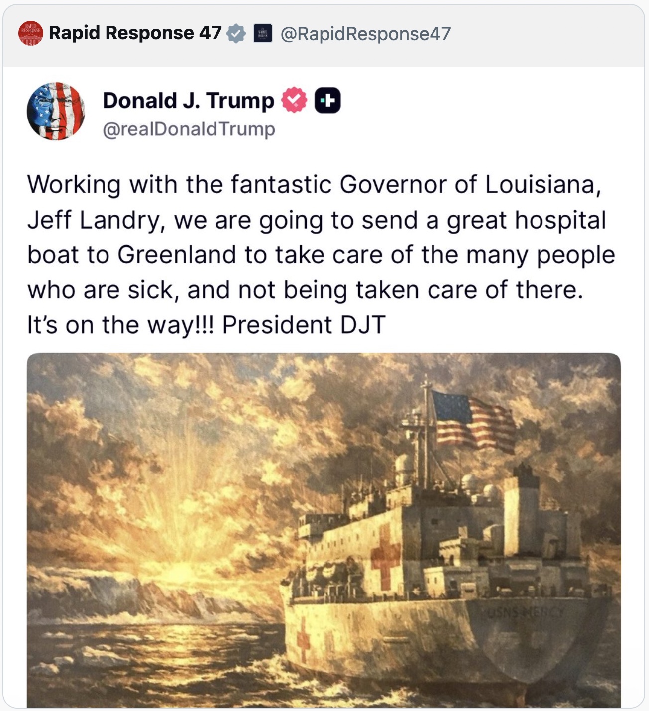 – Saman við fantastiska guvernørinum í Louisiana, Jeff Landry, fara vit at senda eitt fantastiskt hospitalsskip til Grønlands at taka sær av teimum mongu fólkunum, sum eru sjúk, og sum ikki fáa neyðugu viðgerðina har. Tað er á veg!, skrivar Donald Trump.