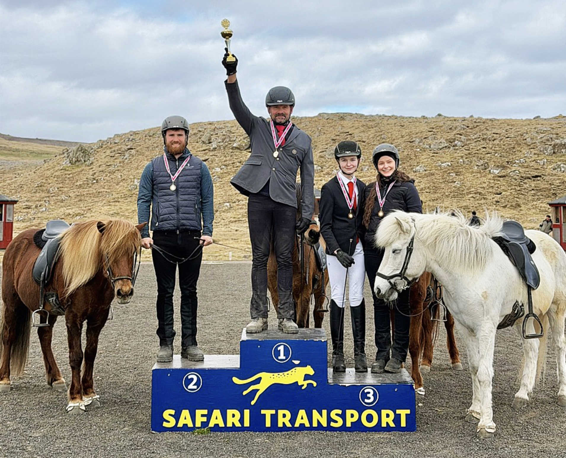 Á myndini síggja vit vinnararnar av fimmgongdini, F1: Nr. 1 gjørdust Knút Lützen og Bergstað frá Þingbrekku, nr. 2 Jógvan Elias Joensen og Gáta frá Víðinesi og á einum deildum 3. plássi vóru Bjørg Nolsøe Mørk og Gylling frá Neðra-Seli og Sedea Bjarnadóttir Nolsø og Rambó frá Hellu