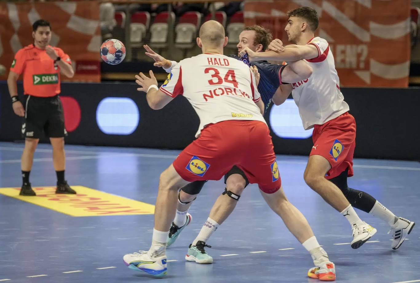 Danmark vann greiðan 34-26 sigur á Noregi. Noreg avrikaði væl í fyrra hálvleiki, og í steðginum var støðan javnleikur 13-13. Í seinna hálvleiki var tó klassamunur, og Danmark vísti hví teir eru fremstu favorittarnir til at vinna EM-endaspælið.