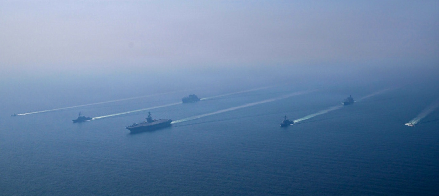 Myndin omanfyri er av einum amerikanskum herskipafylgi - við velduga stóra amerikanska flogberanum, USS Abraham Lincoln, á odda. Myndin er tikin í samband við eina hernaðarvenjing í Arabiska Havinum hin 6. februar í ár.