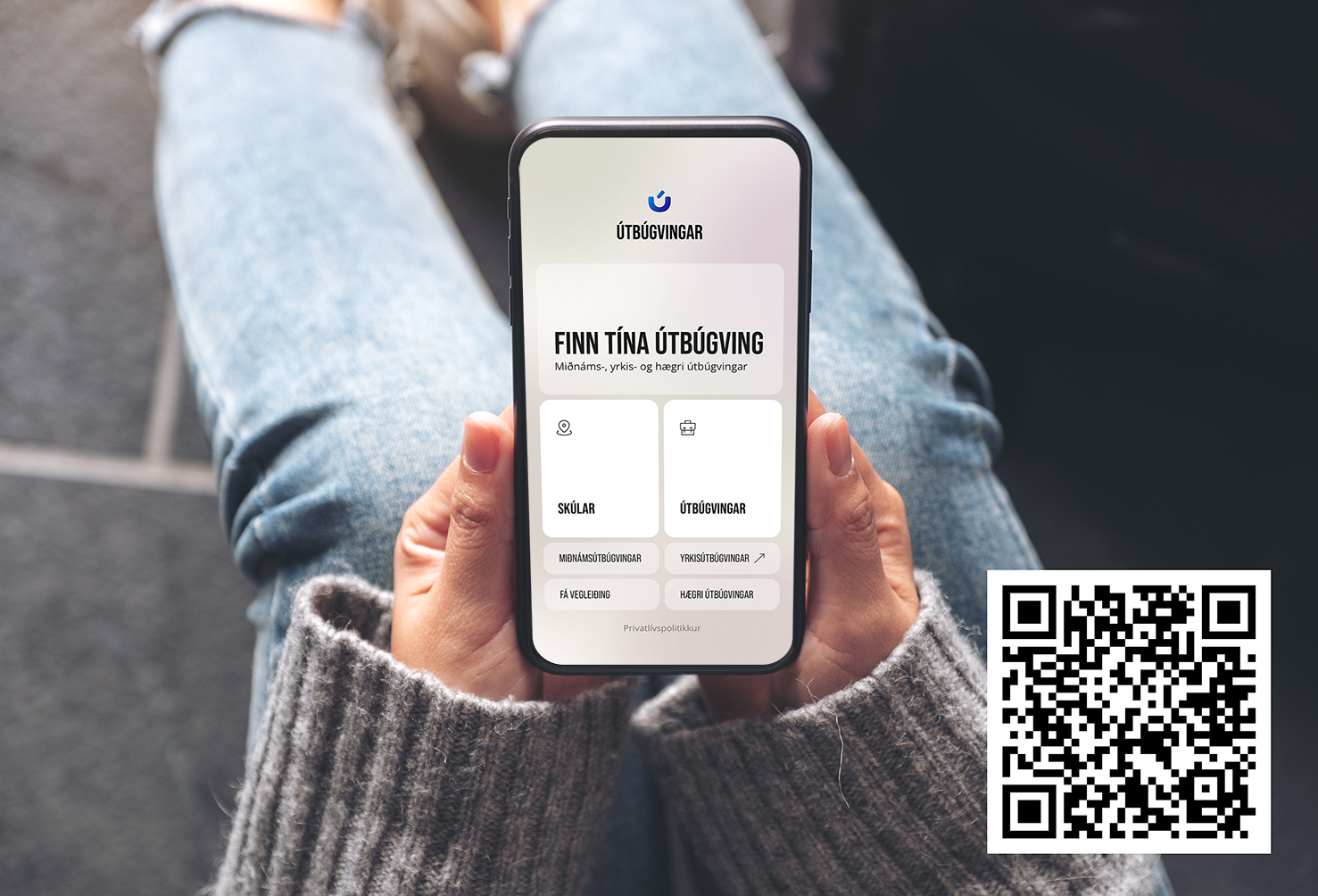 Appin kunnar um allar miðnáms útbúgvingar, yrkisútbúgvingar og hægri útbúgvingar í Føroyum. Appin er serliga ætlað teimum, sum á fyrsta sinni skulu velja eina útbúgving eftir loknan fólkaskúla, tá tað kann tykjast avbjóðandi at fáa yvirlit yvir, hvørjir møguleikar eru. Royn appina við at trýsta á QRkotuna, sum er á myndini, ella tak appina niður á App Store og Google Play, har hon kallast Útbúgvingar.