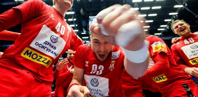 Stórur serbiskur fagnaður í Boxen í Herning (Mynd: Eurohandball)